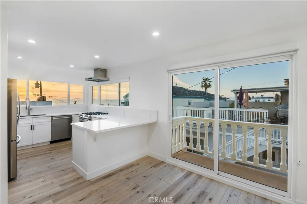 Fully remodeled 2-bedroom, 1-bath apartment offering breathtaking panoramic ocean views. This light-filled residence features a spacious living area and a large modern kitchen equipped with a full suite of top-tier appliances. The updated bathroom includes a Jacuzzi tub and double-sink vanity. Enjoy indoor-outdoor living with a private balcony, plus access to an expansive 1,850 SF shared rooftop deck complete with a natural gas fire pit and sweeping views from Palos Verdes to Point Dume, Malibu. Additional features include in-unit washer and dryer, air conditioning and heating, private storage with shelving, and designated 2-car garage parking. Ideally located just steps from the beach, popular neighborhood restaurants, and local market. Pet friendly.